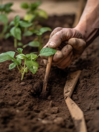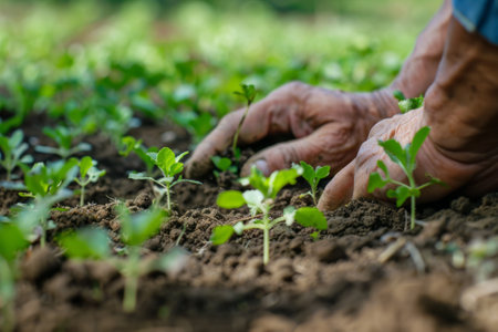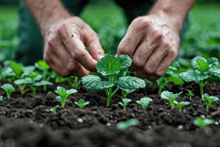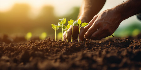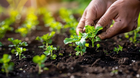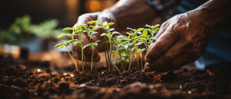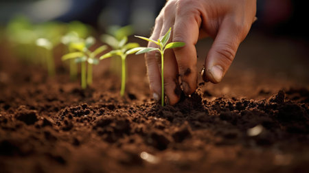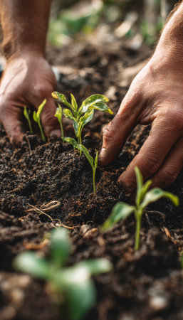 Close-up of hands nurturing young seedlings in rich compost, symbolizing sustainable farming and environmental stewardship. the image conveys growth, care, and a connection to nature, emphasizing eco-friendly agricultural practices.