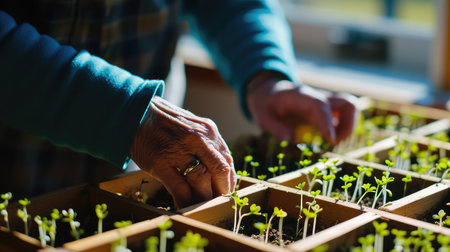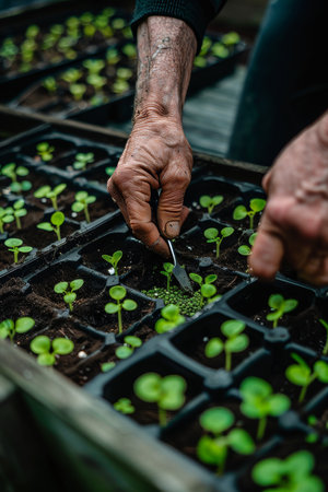 Close-Up, Senior Hands Planting Seedlings in Seed Trays, Sustainable Gardening, Spring