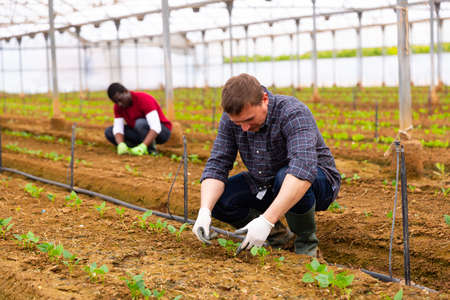 Male farmers working at greenhouse plantation