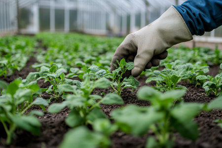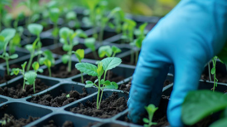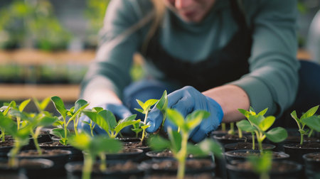 In a bright greenhouse, a gardener in gloves carefully prunes young seedlings, ensuring healthy growth among neatly arranged plants in fertile soil.