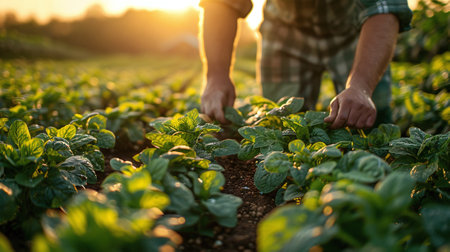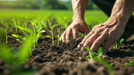 A farmer tending to a lush green field, rural landscape, close-up of hands in soil, symbolizing agriculture and sustainability. Resplendent.