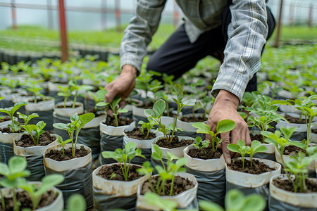 A farmer is kneeling amidst rows of young seedlings growing in individual bags inside a greenhouse. Hands carefully tend to the plants, ensuring healthy growth in the nursery.