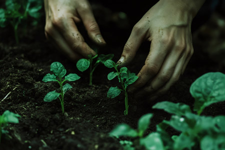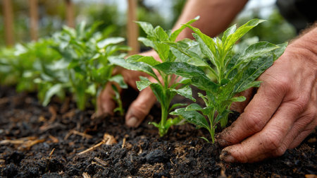 Close up of hands tending to young seedlings in rich dark earth, showcasing new life and growth in agriculture