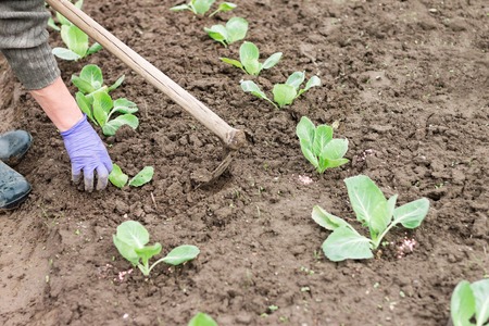 Woman working with hoe in the vegetable garden. Planting cabbage seedling. Cabbage growing on fertile soil with fertilizer