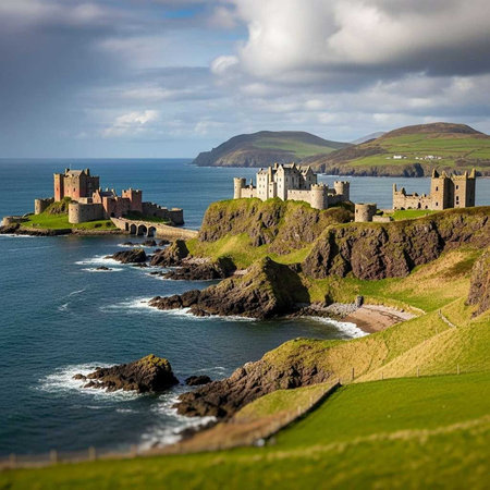 A scenic view of a rugged coastline with ancient castles and rolling green hills under a cloudy sky