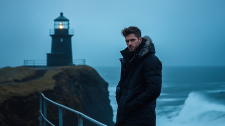 A man stands on a pier next to a lighthouse. The sky is cloudy and the water is choppy