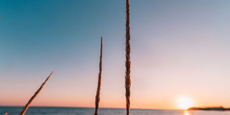 Reeds in sunset macro shot, colorful sky. Nature tranquility and beauty concept