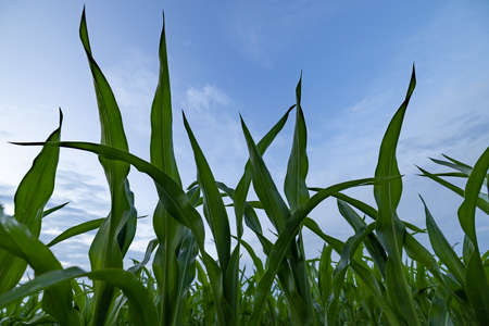 green maize corn crops in the agricultural cornfield with blue sky background, animal feed agricultural industry, Low angle view