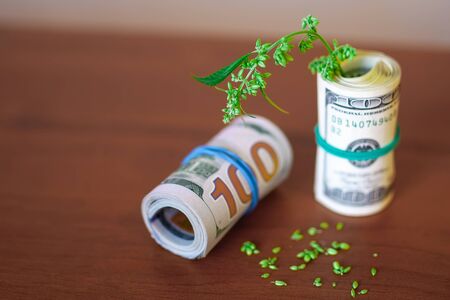 Cannabis CBD with seeds and dollars in money tied with a rubber band. Concept of the production of marijuana products and businesses. CBD hemp oil from natural cannabis