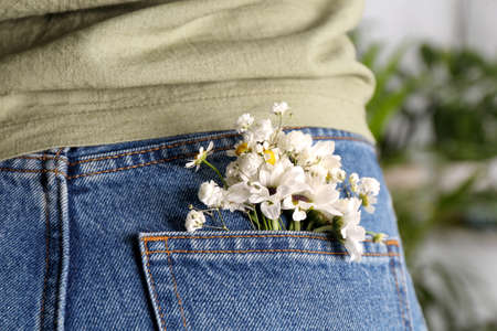 Woman with beautiful tender flowers in back pocket of jeans outdoors, closeup