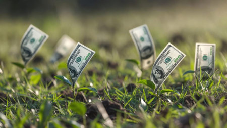 Dollar bills emerging from soil as symbol of financial growth and investment.