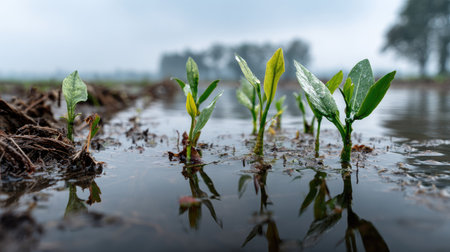 Fresh green shoots rise from waterlogged soil in a serene agricultural landscape, showcasing nature's resilience and beauty under a cloudy sky.