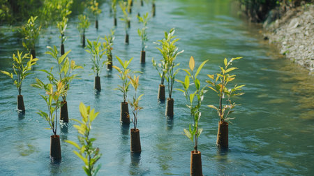 A vibrant image of young trees planted along a riverbank, with the water flowing gently, showcasing the importance of trees for preventing erosion and promoting biodiversity
