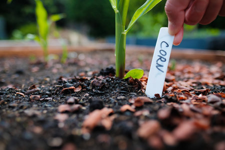 Close up of a growing corn plant with an accompanying label in an urban vegetable garden. Home organic farming.