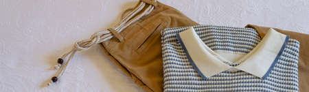 Man cloth from torn clothes with a hole. Top view
