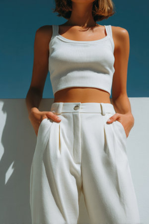 Stylish Woman in White Outfit Under Bright Blue Sky