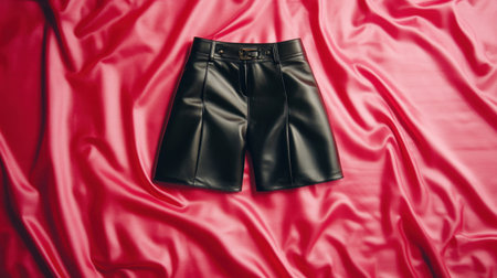 These stylish black faux leather shorts are artistically displayed on a smooth red satin fabric background, showcasing elegance and modern fashion aesthetics.