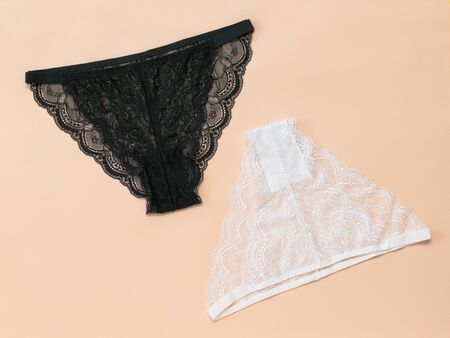 White and black women's panties on a pastel background. The concept of meeting lovers. Underwear. Fashionable concept. Flat lay.