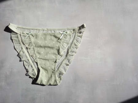 Light green womens panties with ruffles on a gray background with a place for text. High quality photo