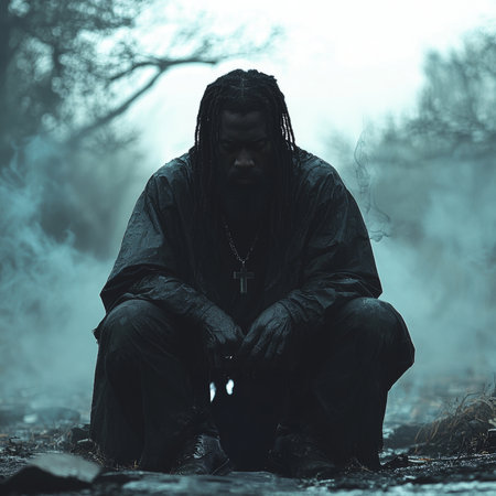 A contemplative individual dressed in dark tones is portrayed holding a cross in a moody and mysterious environment featuring haze and a serene ambiance.