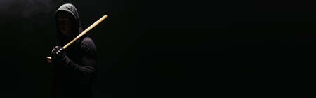 Silhouette of african american bandit in hoodie holding baseball bat isolated on black, banner