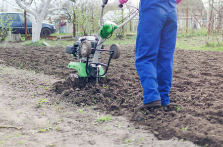 Motor cultivator for digging up the earth. Spring planting and digging in the damp earth.Garden and vegetable garden.Cultivation of crops.Autumn and spring harvest