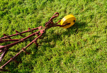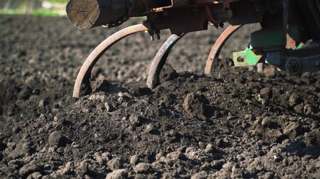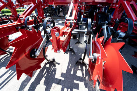 Russia, Leningrad Region - June, 2019: Working bodies of equipment for land cultivation. Agricultural machinery.