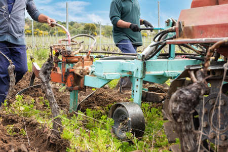 Farm Workers Planting Seedlings in a Sunny Vineyard Field During the Spring Season