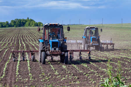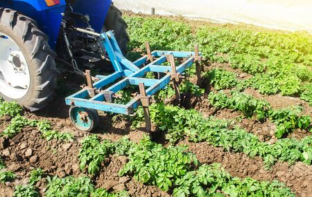 A farmer on a tractor cultivates a potato plantation. Agroindustry and agribusiness. Cultivation of a young potato field. Loosening of the soil between the rows of bushes.