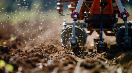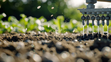 A precision planting machine carefully placing seeds into rich soil with millimeter accuracy