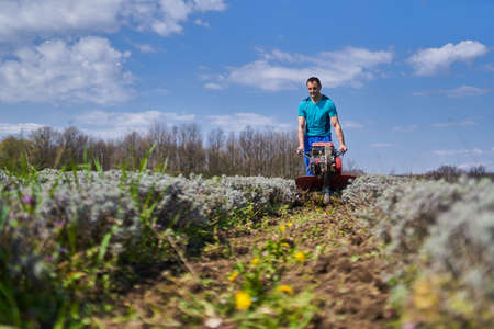 Agribusiness as a guarantee of population prosperity. A farmer cultivates the soil in the field during the spring sowing campaign.