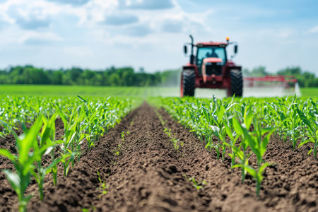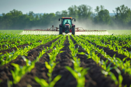 Agricultural machinery applies pesticide on growing corn plants, representing modern farming, crop care, and food production.