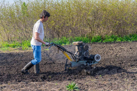 Farmer weeding the field with a tiller. Man loosens the soil cultivator.