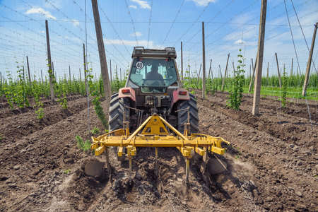 The tractor processes the hops field
