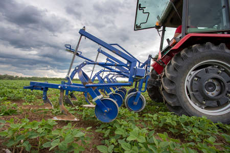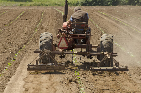 Tractor pulling equipment for hoeing in corn field in spring time