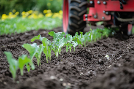 Green seedlings thrive in well tilled soil nourished by sunlight and surrounded by blooming flowers showcasing agricultural growth.
