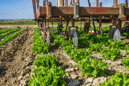 Tractor in a field of green lettuce plants. The tractor is pulling a plow behind it, and the lettuce plants are growing in rows. Cloudy sky in the background
