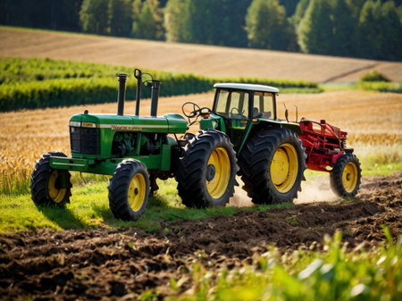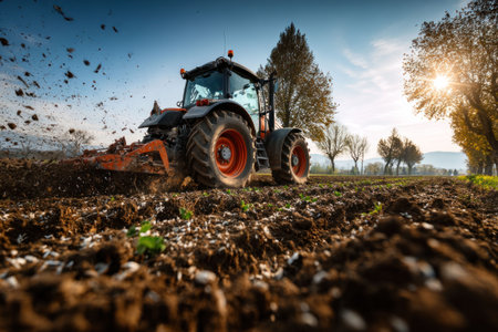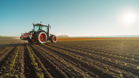 A modern tractor plows through an expansive agricultural field, preparing the soil for a new planting season under a clear sky. AIG41