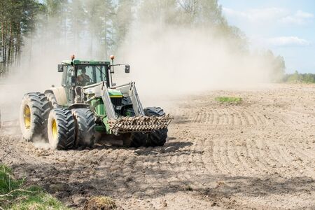 Tractor working in the field preparing the ground for planting