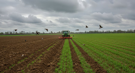 Tractor plowing a field with flying birds in the background, showcasing agricultural activity and the beauty of rural landscapes in a sunny environment