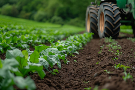 Agricultural tractor driving on field with planted plants