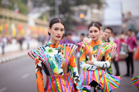 CHIANG MAI, THAILAND - FEBRUARY 08, 2020: Young women dressed in beautiful fancy dresses join the parade at the 44th flower festival parade in Chiang Mai, Thailand