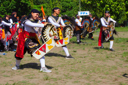 Tenggarong, Indonesia-August 27th,2016. Traditional dance of dayak people with traditional costume participated in erau International folk art festival on August 27th, 2016 in tenggarong, Indonesia.