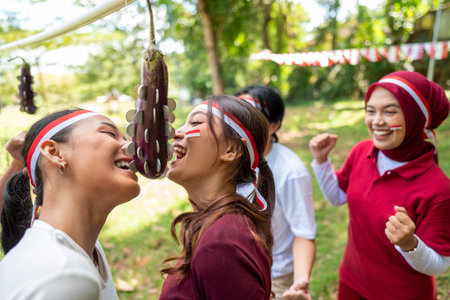 Portrait of an Indonesian southeast asian people celebrate Indonesia Independence Day on the 17th of August with a game of biting coins in eggplant outdoors. Concept of Kemerdekaan Indonesia