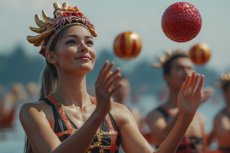 Dancers demonstrate their skill by juggling colorful balls during a vibrant cultural festival near a scenic waterfront.