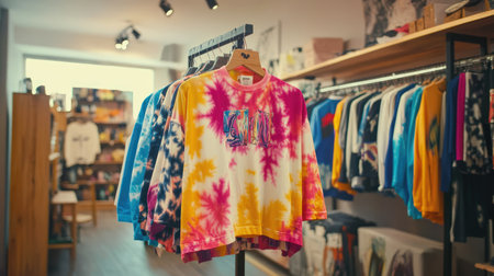 Colorful t-shirts hanging evenly on wooden hangers in a clothing store display. concept of fashion, apparel organization, shopping environment., banner.
