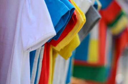 T-shirts on hangers. Stacks of clothes. Shopping in store. Clothes on hangers in shop for sale. Blur background. Fashionable clothes in a boutique. Various clothing on market.