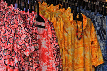 Clothes racks with cotton colorful ethnic dresses on wooden hangers. Showcase with clothes on local street market.