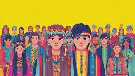 An illustration depicts a diverse group of people, standing together against a yellow background. The individuals are dressed in varied traditional garments, showcasing a range of colors and patterns. The artwork employs a stylized digital painting technique with flat lighting, suitable for a variety of editorial and commercial applications.