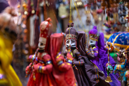 Indian traditional handmade puppet dolls made of jute isolated on blurred background is displayed in a street shop for sale. Indian handicraft and art